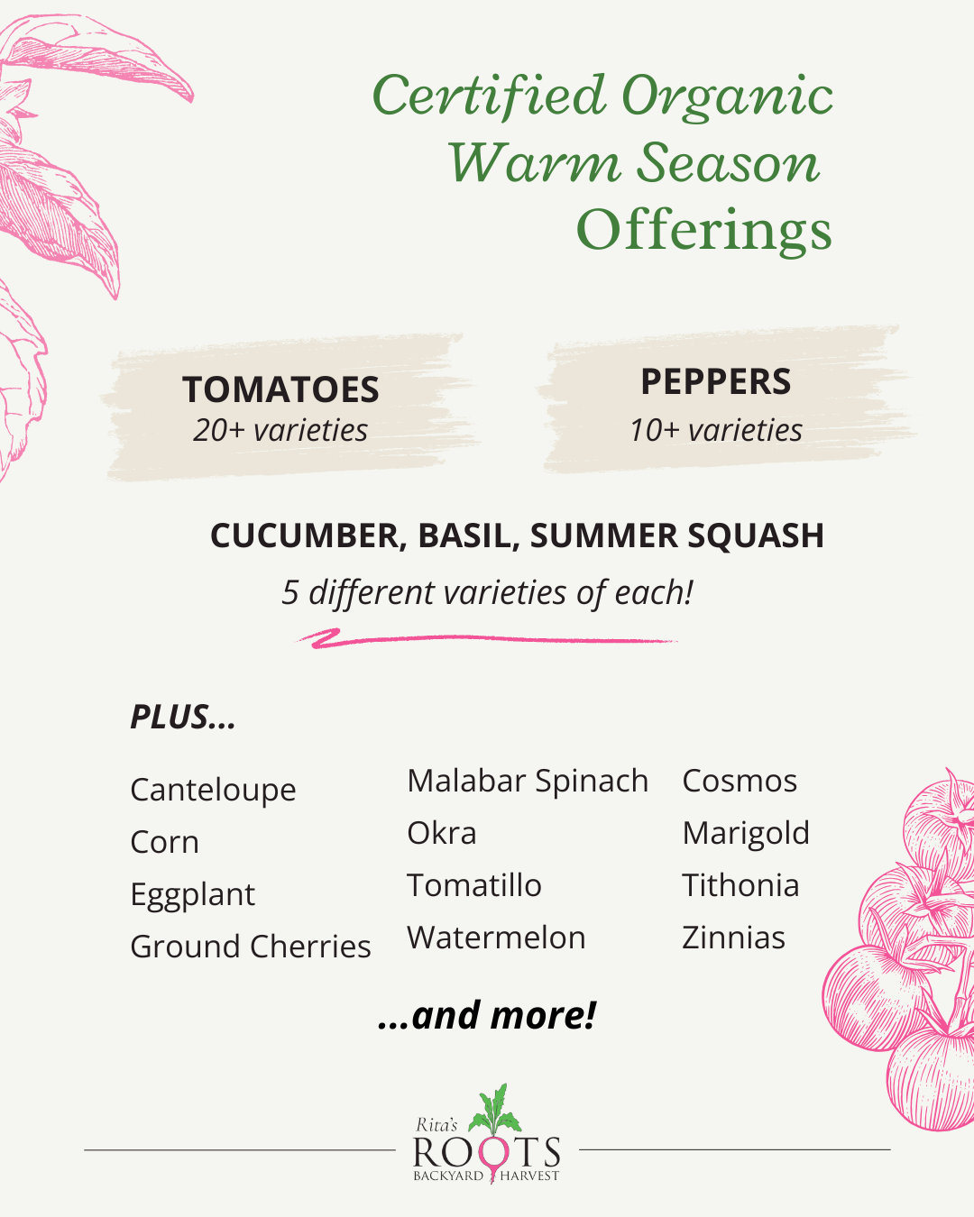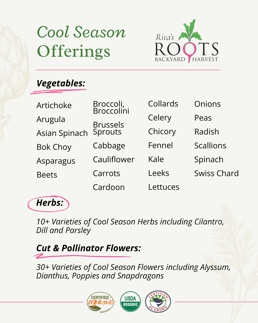 Not only do Lowcountry locals love our plant sales because we take the guesswork out of what to put in the ground and when, we’re proud to sell on the best certified organic vegetable, flower and herb transplants...